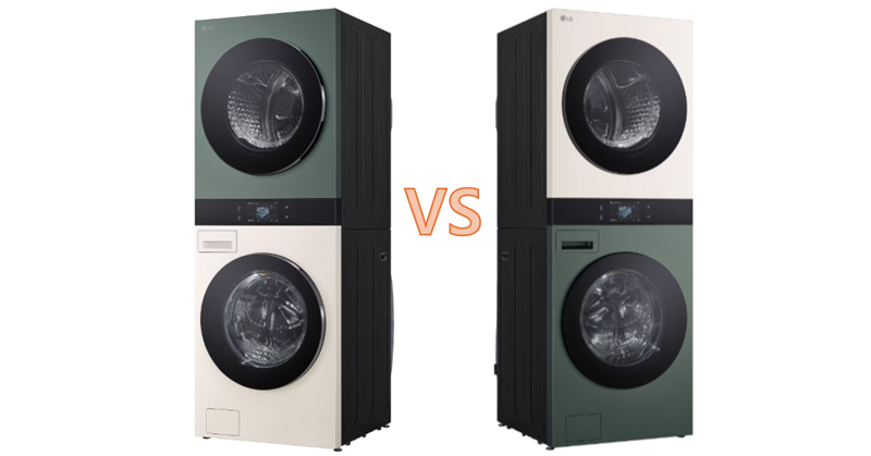 (좌) WA2525EGZF, (우) WA2525GEHF LG 워시타워 WA2525EGZF와 WA2525GEHF의 차이는 색상뿐으로 WA2525EGZF의 본체 색상은 하부(세탁기)는 네이처 베이지, 상부(건조기)는 네이처 그린, WA2525GEHF의 본체 색상은 반대로 하부(세탁기)는 네이처 그린, 상부(건조기)는 네이처 베이지이다.